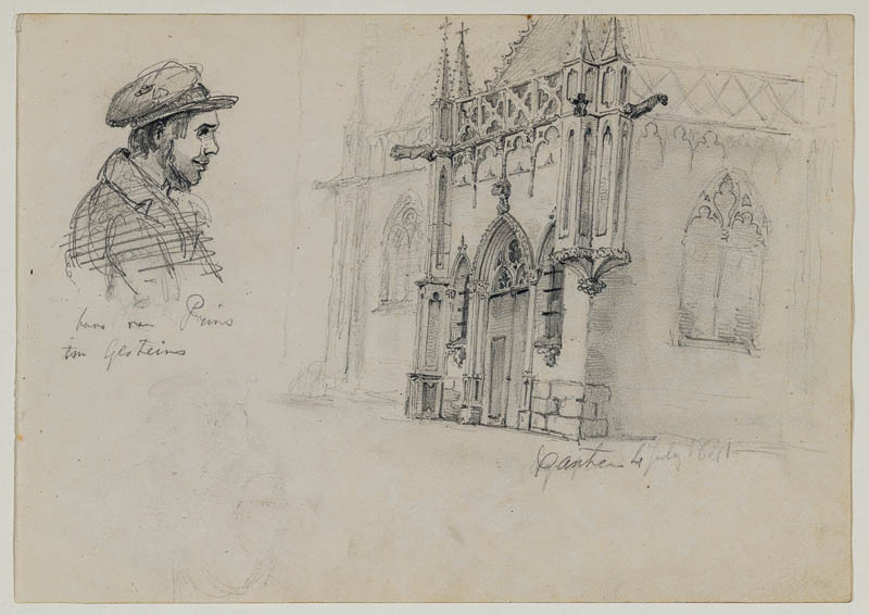 li.: Männerporträt im Profil; unter dieser Skizze in Höhe des Oberarms scheint eine weitere Skizze durch: Gesicht in Frontalansicht; darunter: "baas van Prins im Gesteins" (Neandertal); re. : Architekturskizze, Kirchenportal; bezeichnet.: "Xanten 4. July 1841" (dieser Eintrag scheint später hinzugefügt zu sein), unter Xanten ist unleserlich ein weiterer Schriftzug zu erkennen; Datum aber beibehalten.