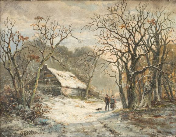 Winterlandschaft; in der Bildmitte ein Mann und eine Frau mit einem Hund
