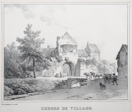 Dehors de Village; Stadttor; Viehtreiber treibt Stiere über die Brücke; nach B.C. Koekkoek.