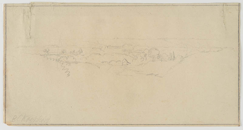 Skizzenbuchblatt: Dorf mit Kirchturm in einer Hügellandschaft.