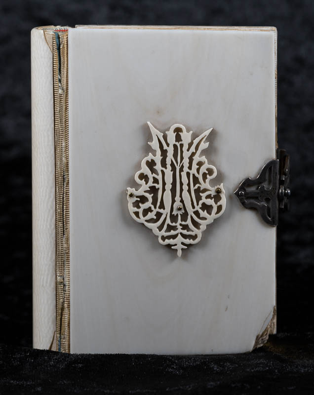 Umschlag Elfenbein und Bein (Rücken); auf Vorderseite ausgesägtes Ornament aus Elfenbein (M oder AM?), silberne Schleiße (M); Goldschnitt, Vorsatzblätter Seide.