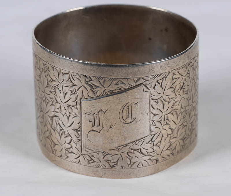 Breiter, runder Ring mit eingravierten Baumblättern und schrägem Flach mit Gravur der Buchstaben V.C.(?).