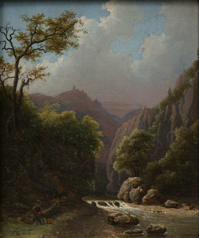 Bach in einer Felsenlandschaft. Links sitzender Mann mit Hund.