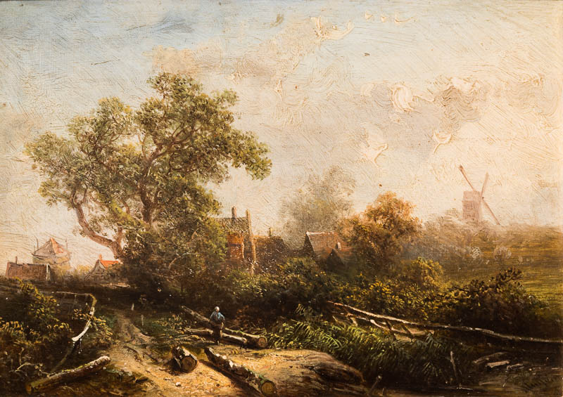 Im Vordergrund geht eine Frau einen Weg mit Baumstämme entlang; hinter einem Baum verborgenes Dorf, rechts im Hintergrund eine Mühle.