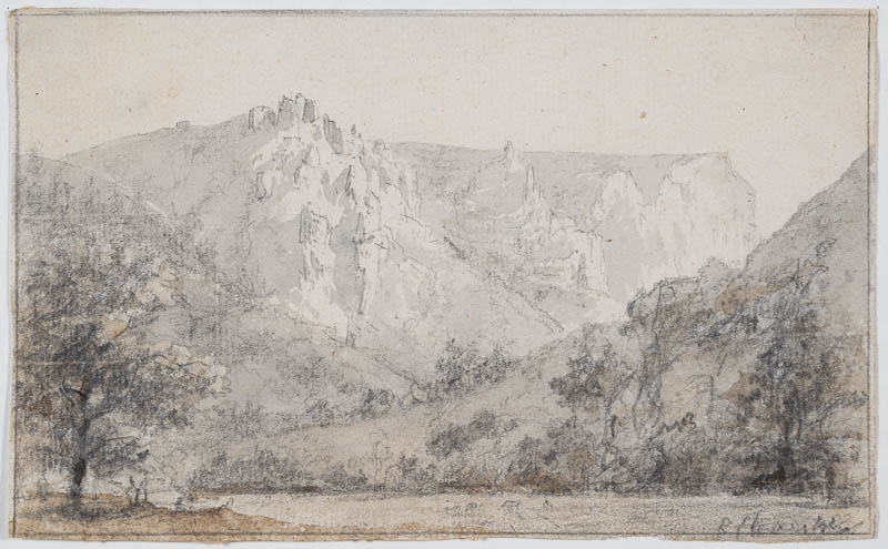 Flusstal mit steil ansteigenden Hügeln; auf der Höhe des hinteren Hügels Ruine.