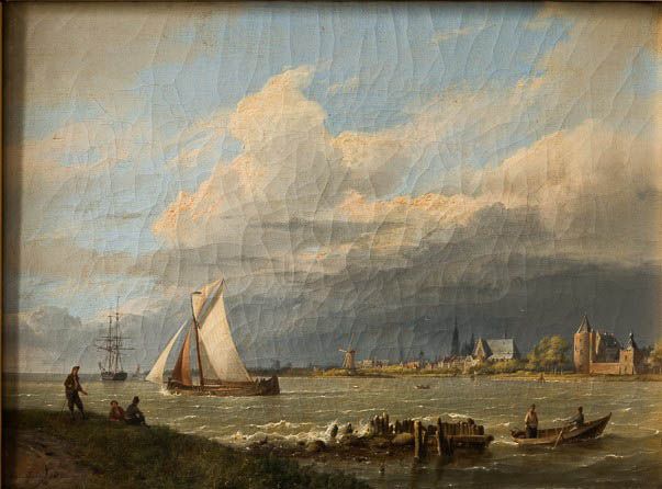 Meereslandschaft mit mehreren Booten; rechts im Hintergrund die Stadt Medemblik (Nord-Holland) und Schloss Radboud, 1848.