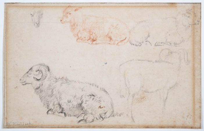 Studienblatt mit Schafen und Widdern, in zwei Reihen; Oben v.l.n.r.: Kopf von vorn gesehen; liegendes Schaf von der Seite gesehen, nach links (in rote Kreide); liegendes Schaf von der Seite gesehen, nach rechts (Skizze in Umrissen)Unten v.l.n.r.: liegender Widder von der Seite gesehen, nach links; stehender Widder schräg von der Seite nach rechts (Skizze in Umrissen).