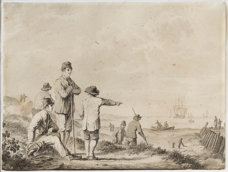 Fischer am Meeresstrand. Vorne links drei Personen, wovon einer sitzend. Mehr nach hinten mehrere Figuren. Am Horizont im Meer Schiffe.