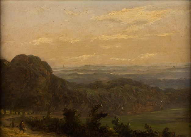 Hügellandschaft mit Reisender links.