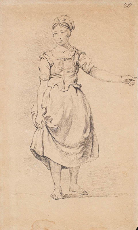 Figurenstudie einer jungen Frau in Weste und Haube bekleidet, barfüßig stehend, frontal gesehen; mit der linken Hand zeigend (der Finger von der Zeichnung abgeschnitten), die rechte den Rock raffend.