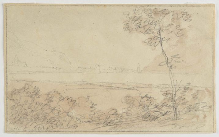 Skizzenbuchblatt: Rheinlandschaft mit Stadt, im Vordergrund ein Baum und Ufer.