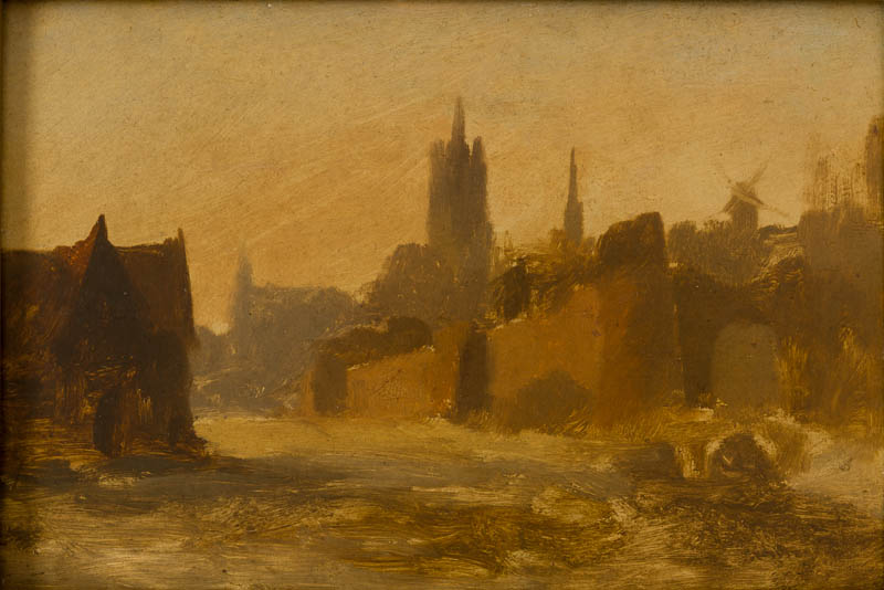 Ummauerte Stadt mit Kirchtürmen und Mühle