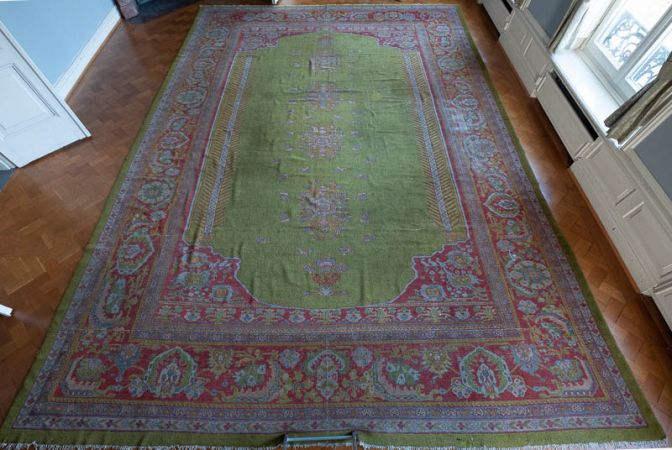 Mahal Teppich, Westpersien; mehrere vernähte Längs- und Querschnitte in der Bordüre; originale Breite, wohl in der Länge verkürzt obwohl das Feldmuster vollständig ist.
