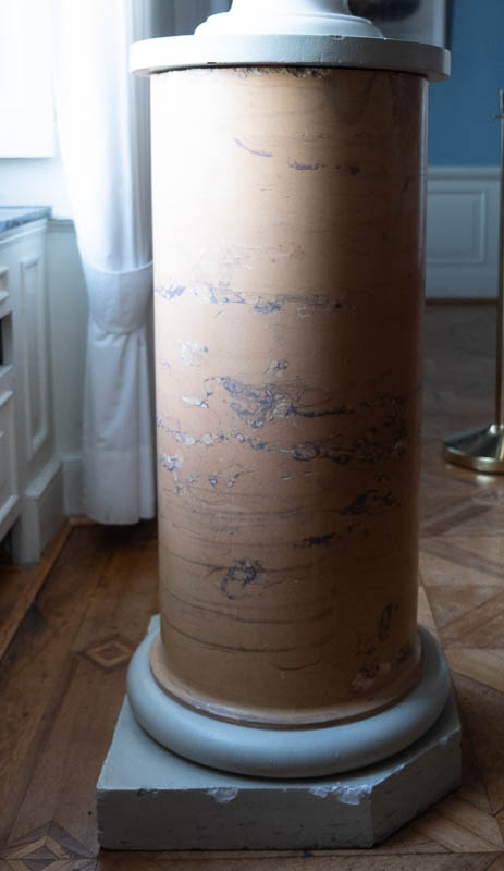 Orangefarbener, marmorierter Sockel; identisch: verschiedene Sockel von der Einrichtung des königlichen Palast (ehem. Rathaus) zu Amsterdam in Auftrag des Königs Lodewijk Napoleon um 1808 ff; Büste (Nr. 1273 ist auf diesem Sockel platziert.