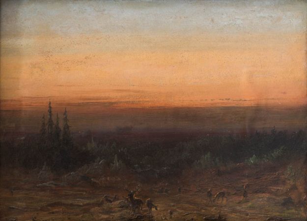 Heidelandschaft mit Hirschen am Abend, links Tannengruppe.