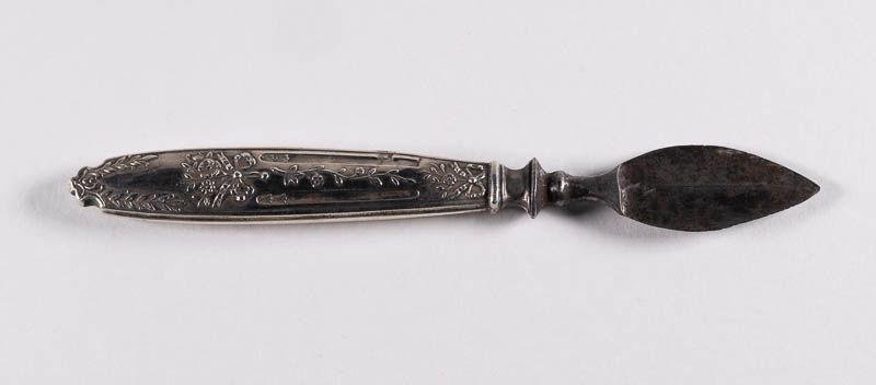 Garniturteil; blattförmiges Messer mit großem reliefdekoriertem Griff.