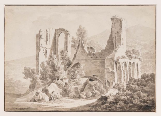 der Titel, 'Ruine bei Kleve' auf der Rückseite, ist nicht eigenhändig; Im Tal eines Waldgebirges rastet ein Wanderer vor dem Trümmern einer gotischen Klosterruine.