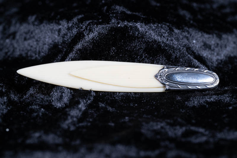 Übereinander liegende große und kleinere Messerformen aus Bein; silberner Handgriff mit Reliefrahmung.