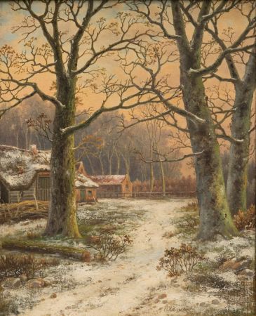 Winterlandschaft; ein von drei Bäumen gesäumter Weg führt auf ein Gehöft zu.