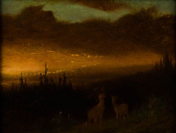Zwei Hirsche am Waldrand im Sonnenuntergang.