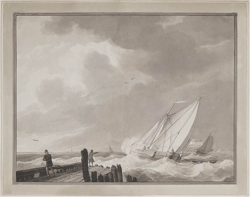 Veersegat; Segler kreuzen auf bewegter See gegen den steifen Wind; hinten links die Türme und Giebel von Veere.