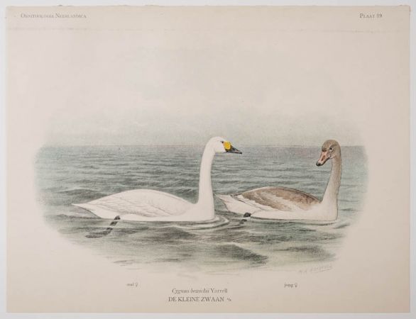 Der Zwergschwan, Cygnus bewickii, Yarrell; Abbildung aus "Ornithologia Neerlandica"; Plaat 39. Herausgeber Daniël van Oort (1876-1933)