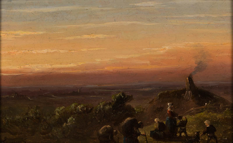 Heidelandschaft bei Dämmerung; rechts Kohlemeiler und Figurenstaffage (2 Lastenträger, Frau mit Kindern und Hund); im Hintergrund am Horizont links ein Ort mit Mühle.