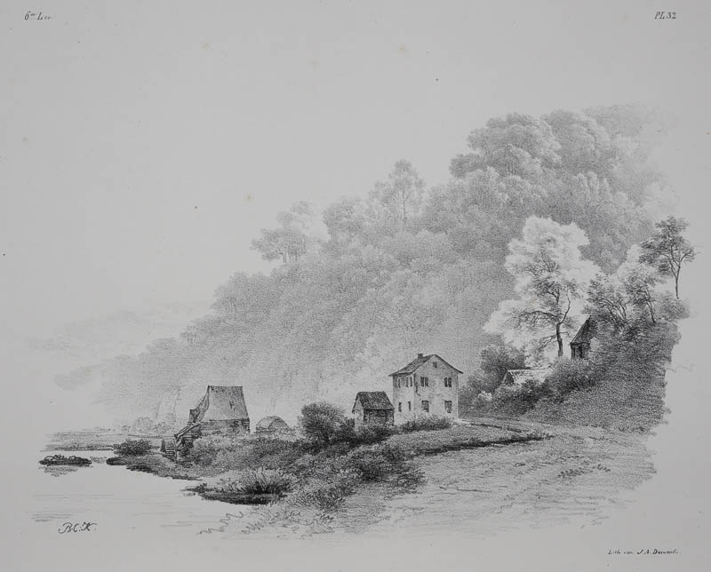 Landschaftsstudien / landschapstudies; ein Weg führt zu einigen Häusern mit Wasserrad (Plasmolen?); 31. Blatt von 59 Lithographien.