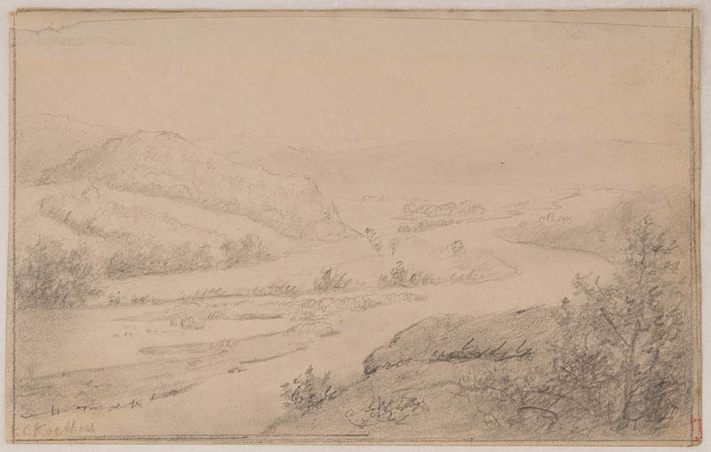 Blick in ein weites Flusstal mit Baum und Gebüsch im Vordergrund.