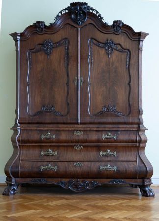 Schrank mit gebauchtem Sockel mit drei Schubladen, wobei die obere aus drei Teilen besteht: die mittlere davon als Schreiblade eingerichtet; oben zwei Türen.