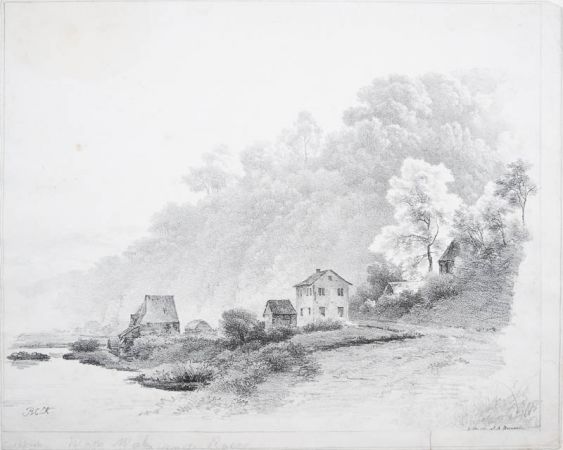 Landschaftsstudien: Wassermühle an der Ruhr; aus "Landschap Studien" Ausgabe Koekkoek / Daiwaille 6. Lev. Pl. 32 (Inv.nr. 0908); nach B.C. Koekkoek und von ihm selbst mit Bleistift umrahmt und beschriftet.