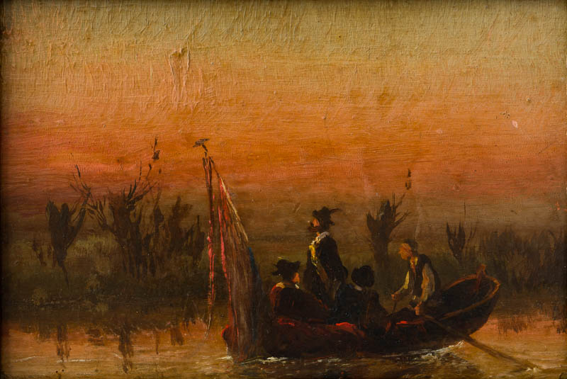 Vier Figuren in Tracht des 17. Jh. in einem Ruderboot bei Abend.