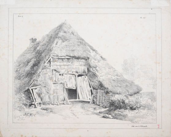Landschaftsstudien: verfallene Bauernkate; aus "Landschap Studien" Ausgabe Koekkoek / Daiwaille 4. Lev. Pl. 23 (Inv.nr. 0873); nach B.C. Koekkoek und von ihm selbst mit Bleistift umrahmt.