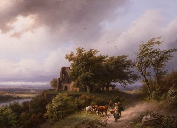 Heimkehrende Bauern mit Vieh bei aufziehendem Gewitter in einer Rheinlandschaft mit Burgruine.