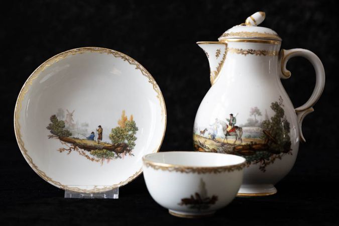 Teeservice: Teekanne, Milchkanne, Zuckerbüchse, Spülnapf, 9 Teetassen; weißes Porzellan, bemalt mit polychromen Pastorallandschaften.