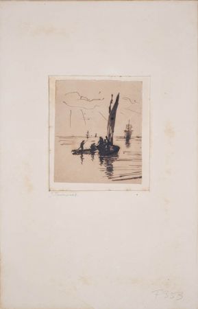 Segelschiff und Ruderboot im Vordergrund; im Hintergrund größere Schiffe auf See.