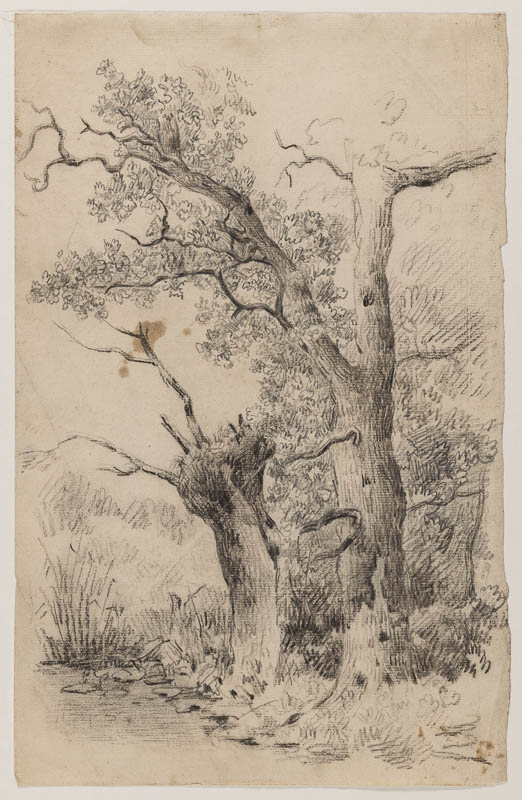 Baumstudie von zwei Bäumen, wovon eine Kopfweide, stehend am Rande eines Teiches.