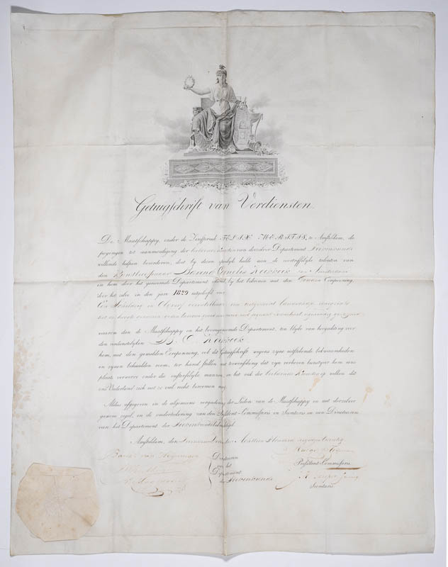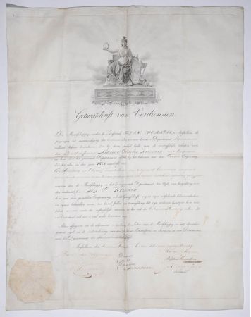 Von der Gesellschaft 'Felix Meritis' Amsterdam ausgestelltes Verdienstzertifikat an B.C. Koekkoek, den 7. Dezember 1829; eine goldene Ehrenmedaille wird ausgereicht für das Gemälde: 'Een schilderij in olieverf voorstellende: een uitgestrekt landschap eenigzints uit de hoogte genomen: op den breeden grond een rivier met piquant zonlicht eigenaardig gestoffeerd' - 'Ein Ölgemälde, das folgendes darstellt: eine weite Landschaft, die etwas von oben aufgenommen wurde: auf dem breiten Boden ein Fluss mit pikantem Sonnenlicht, der sonderbar dekoriert ist'.