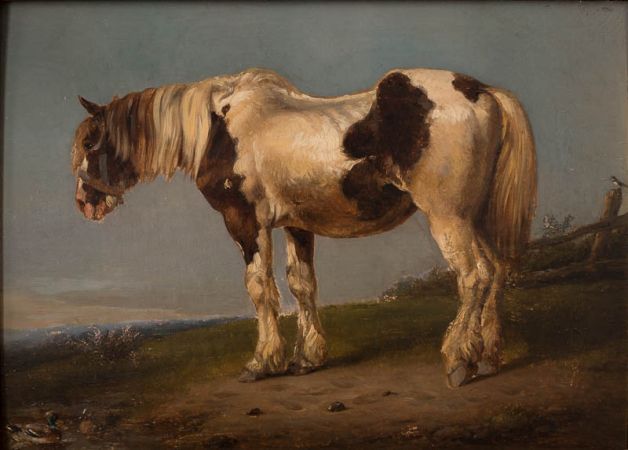 Das alte Pferd; das alte braun-weiß gefleckte Pferd steht mit gesenktem Kopf am Rande eines Weihers, vor ihm auf einem kleinen Teich eine Ente, der Himmel ist strahlend blau; am Horizont sind verschwommen einige Hügel auszumachen.
