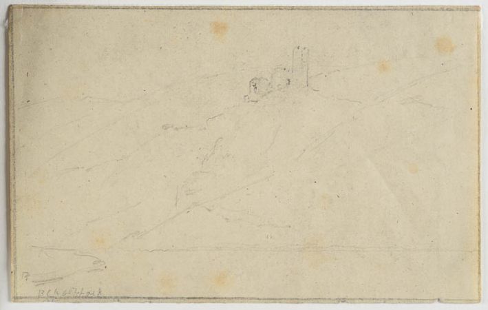 Skizzenbuchblatt: Landschaft mit Burgruine und Flussufer.