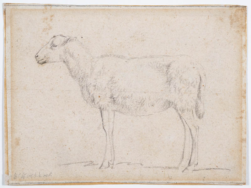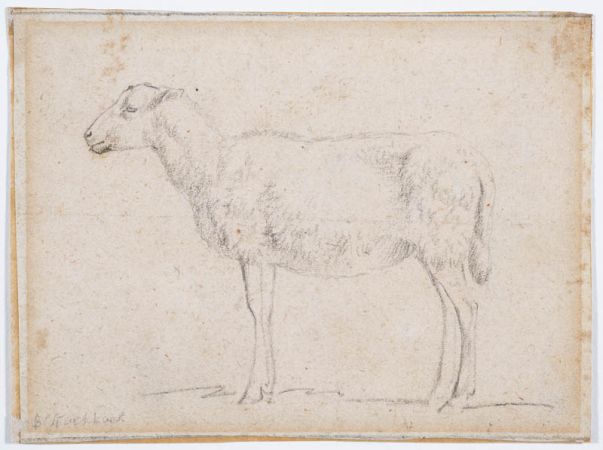 Stehendes Schaf von der Seite gesehen, nach links; auf der Rückseite: Leib eines Schafs von der Seite.