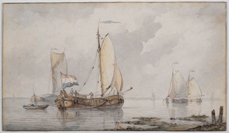 im ruhigen Wasser liegen bei flauem Wind einige Segelschiffe, von denen eines im Vordergrund die niederländische Flagge gehisst hat.