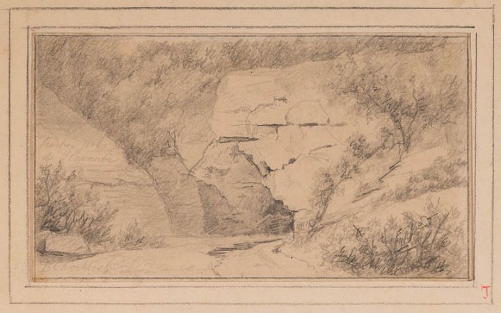 Felsen bei Slavante, Maastricht; im Vordergrund Gebüsch, in der Mitte führt ein Weg Richtung Felsen. Bezeichnet: Rocher pres de Slavande