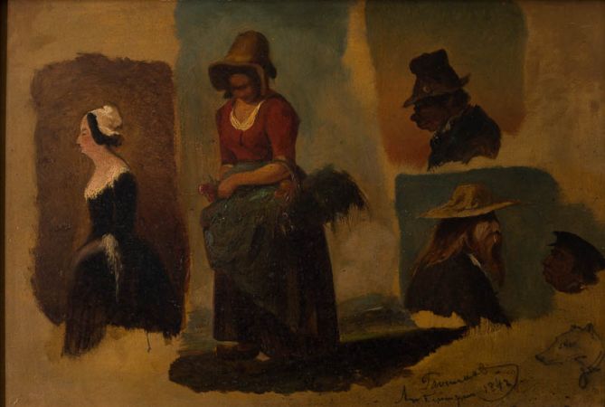 Figurenstudien: Dame, Bauernmädchen, drei Köpfe, Hundekopf.