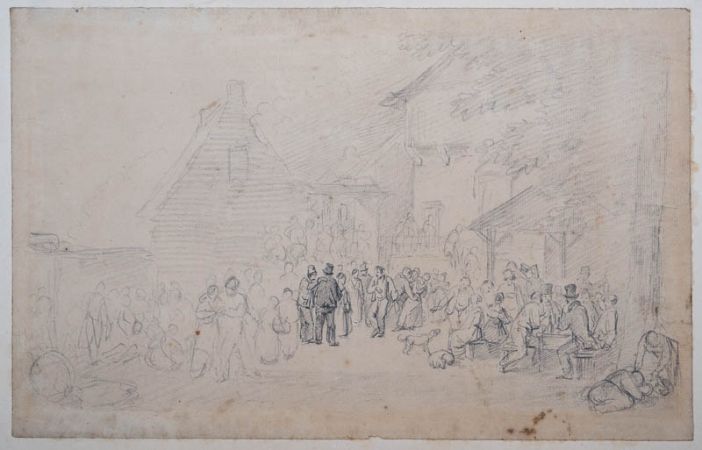 Figurenreiche Szene von sitzenden und stehenden Männern und Frauen im Freien bei einer Gruppe Häuser; unvollendete Zeichnung.