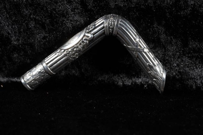 Rechteckig, gebogener Griff für einen Kindersonnenschirm; gerippt, mit gekreuzten und rechten Bändern; auf der Vorderseite reichumrahmtes Oval mit eingraviertem Monogramm CM (?).