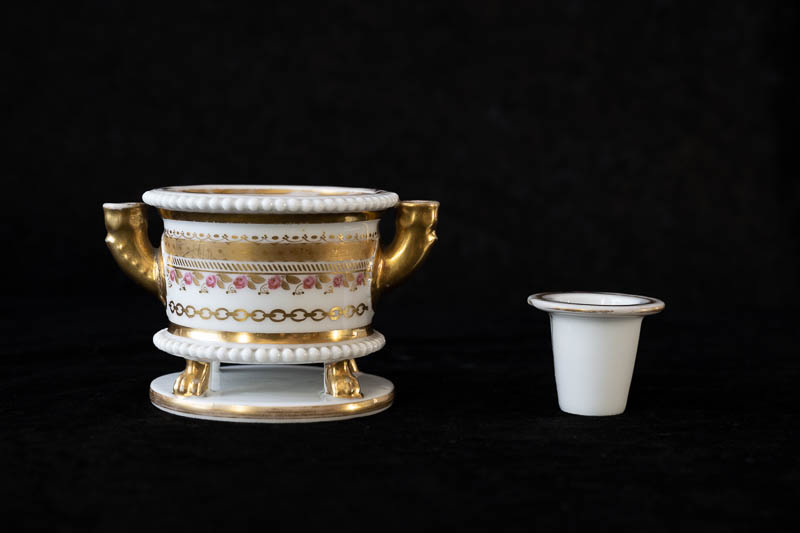 Runder Behälter, mit 4 Füßen auf runder Grundplatte stehend; dazugehörend eine kleine Tintenfass-Loge; links und rechts vergoldete Behälter für Federn; in gold und rosa dekoriert.