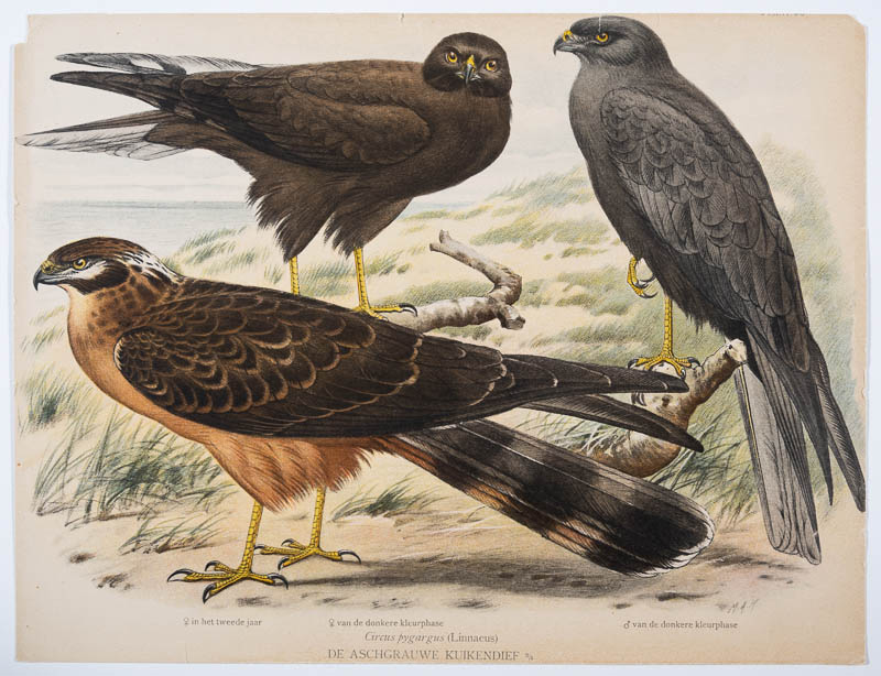 Die Wiesenweihe. Circus pygargus (Linnaeus), abgebildet im zweiten Jahr und der dunklen Farbphase; Abbildung aus "Ornithologia Neerlandica"; Plaat 93. Herausgeber Daniël van Oort (1876-1933)