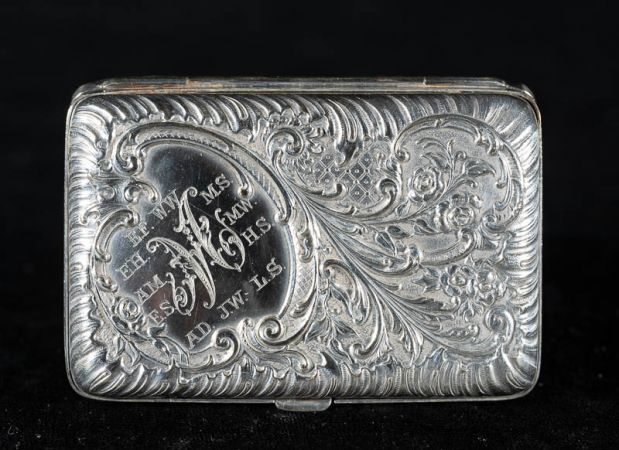 Hochrechteckige Form; Deckel und Boden in Relief; gegossen dekoriert mit Blumen und Rokoko Kartusche, worin eingraviertes Monogramm des Eigentümers und der Mitschüler im Deckel.