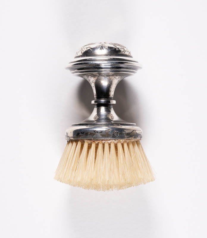 Kleine Bürste aus einer Toilettengarnitur, mit silbernem Griff; gewölbte obere Fläche mit ornamentaler Gravierung, u.a. mit gekreuztem Kapitalbuchstaben 'L'.